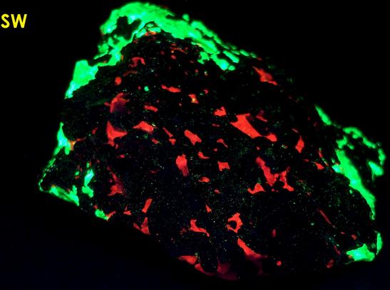 Green SW and LW fluorescing Willemite, black Franklinite (slightly magnetic due to small amounts of exsolved Magnetite) and red SW / dark magenta LW fluorescing Calcite.