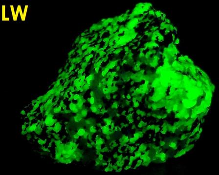To show the fluorescent response the specimen was illuminated using 6 watt 254nm (Short Wave) / 366nm (Long Wave) UVGL-58 lamp (you need a proper UV light source to observe the fluorescence, more powerful lamp = brighter response).