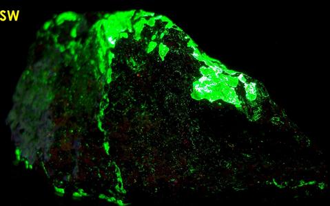 Black Franklinite, red Zincite, with a coating of white Hydrozincite. Under UV illumination green SW LW fluorescent Willemite lights up and Hydrozincite fluoresces SW LW in shades of blue.