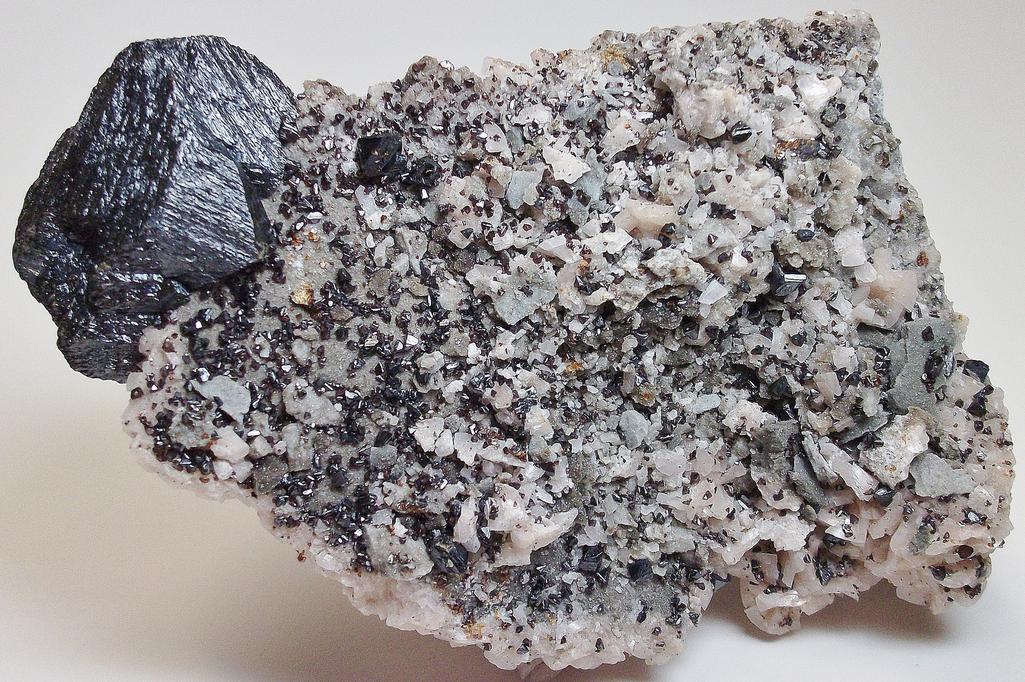 Dark Sphalerite crystals (Largest 44 x 32 x 25) with pink-white Dolomite crystals and minor Chalcopyrite crystals on a Chert matrix.